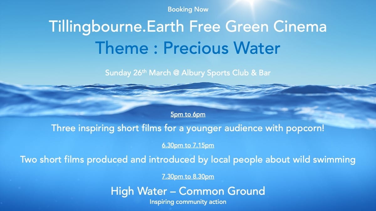 »Tillingbourne.Earth is hosting a “GREEN CINEMA” event on Sunday 26th March from 5.00 pm to 8.30 pm Theme: Precious Water 💦. I’m heading there when I return from Bath👇