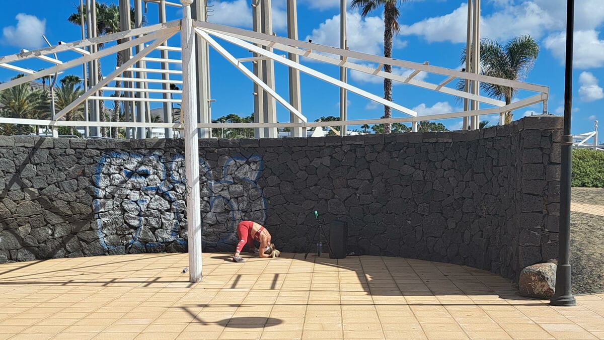 running a fitness class, being transmitted live via a mobile on a tripod